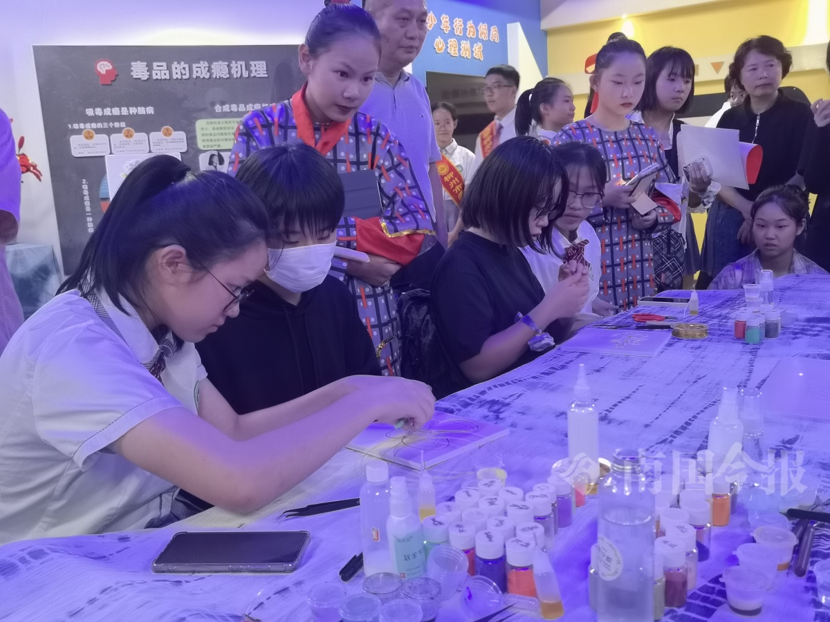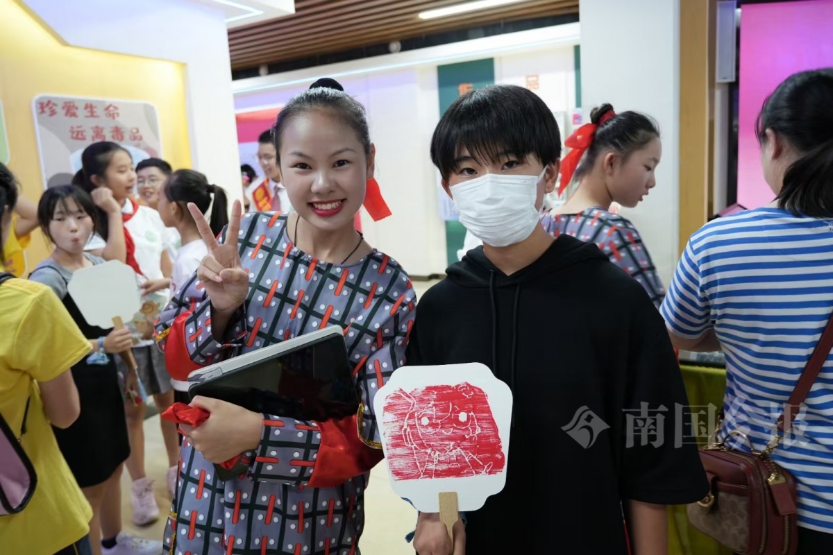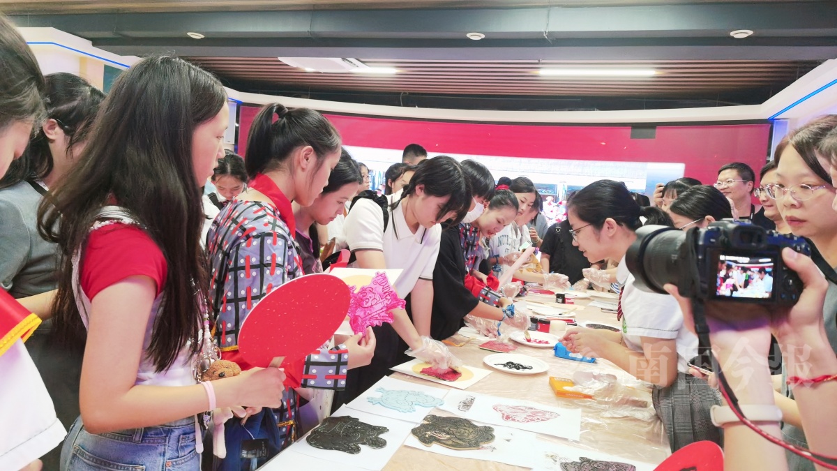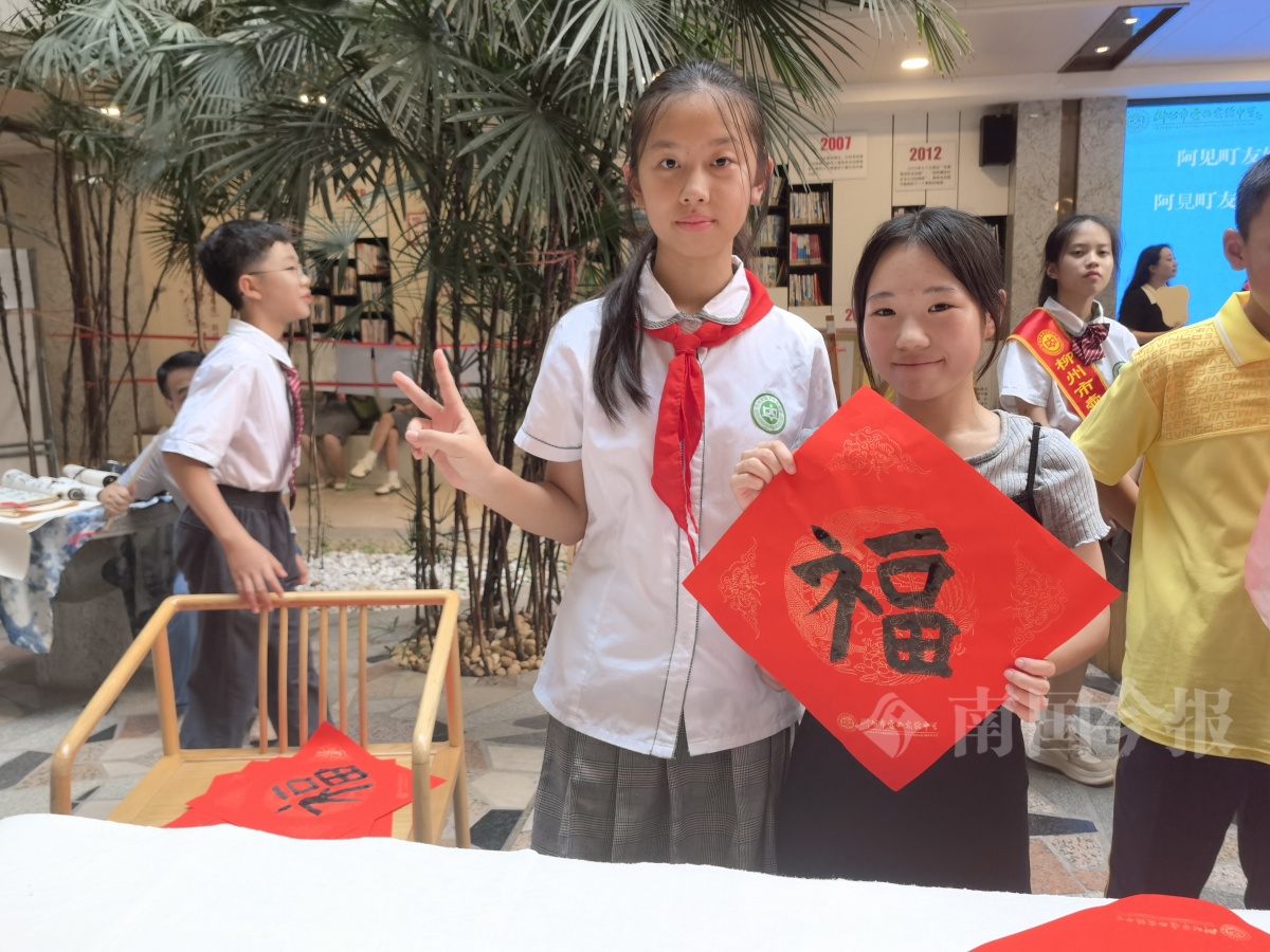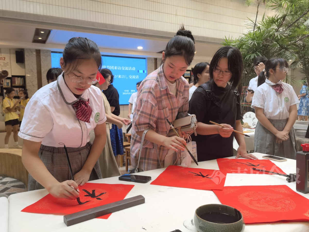 阿见町友好访问团成员还现场体验了掐丝珐琅画、拓印等特色课程项目。在壶西实验中学学生的演示下,日本学生拿起毛笔,现场进行了书法创作体验。