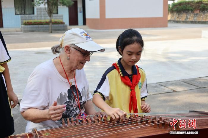 9月8日,壶西实验中学学生教美国飞虎队老兵后裔弹古筝
