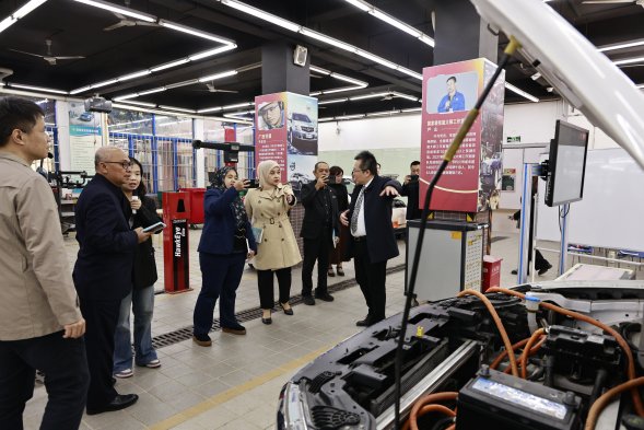 图为马来西亚外宾参观柳州城市职业学院机电与汽车工程学院(摄影:柳州城市职业学院)